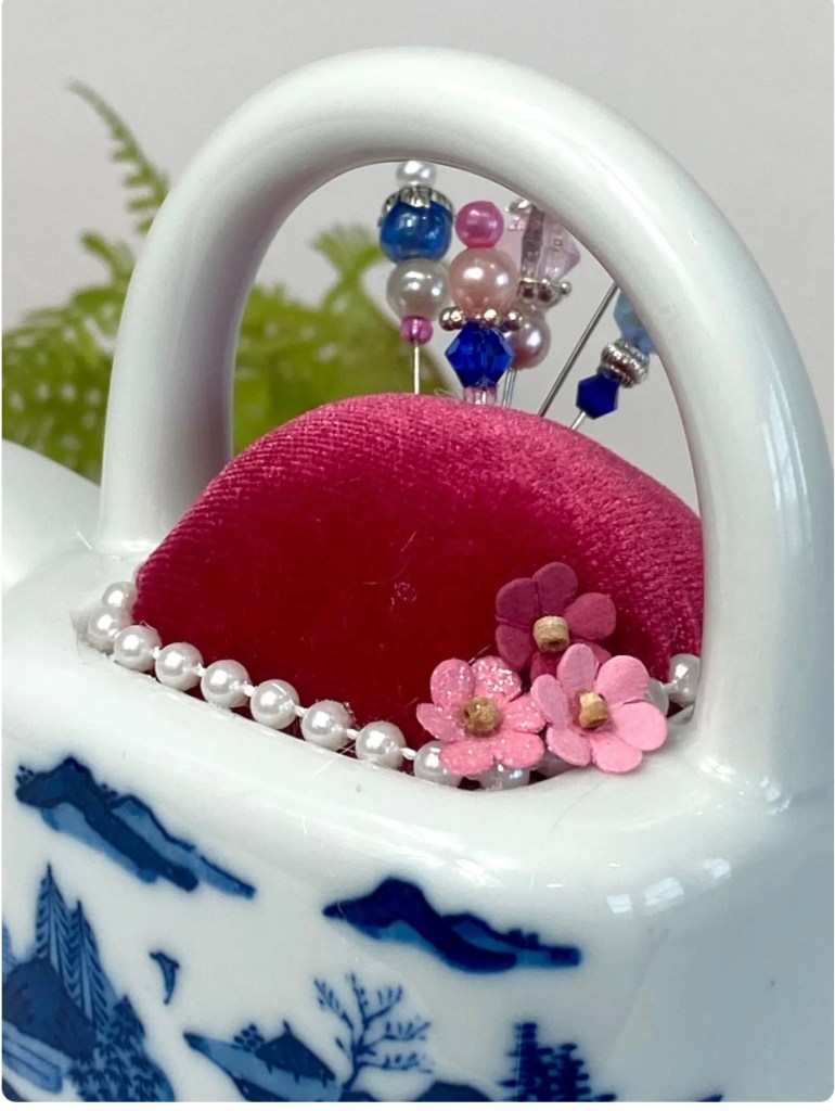 When I came across this delicate Japanese mini teapot, I knew it wasnβt destined to sit forgotten on a shelf. The blue-and-white pattern whispered of tradition, and its petite size made it absolutely perfect for transformation. With a touch of velvet, a string of tiny pearls, and a handful of whimsical beaded pins, this little teapot became something more β a pincushion full of personality and joy.